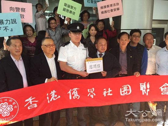 大公网2月14日讯(记者龚学鸣、文轩、朱晋科、许嘉信)大年初一的旺角暴乱中,维持秩序的警察竟被暴徒追打,引起社会公愤。昨日多个团体前往警署慰问,并谴责参与旺角骚乱的暴徒,强调香港市民不容暴力行为,要求警方严正执法。有商界代表更指出,前年占中事件已令商户生意下跌,担心今次暴乱会令商户雪上加霜,业界必须站出来,向暴力乱港者说不!