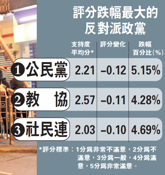 香港研究协会最新民意调查显示,近九成反对派政团在旺角暴乱事件后评分下跌,其中公民党评分下跌最多,跌幅超过半成(见表)。协会负责人认为,旺角暴乱事件动摇影响本港作为安全城市的形象,促请各政团向社会各界表达清晰信息,不要将暴力行为合理化,并竭力维护香港法治;同时要就事件进行反思,研究如何修补当前社会的局面。