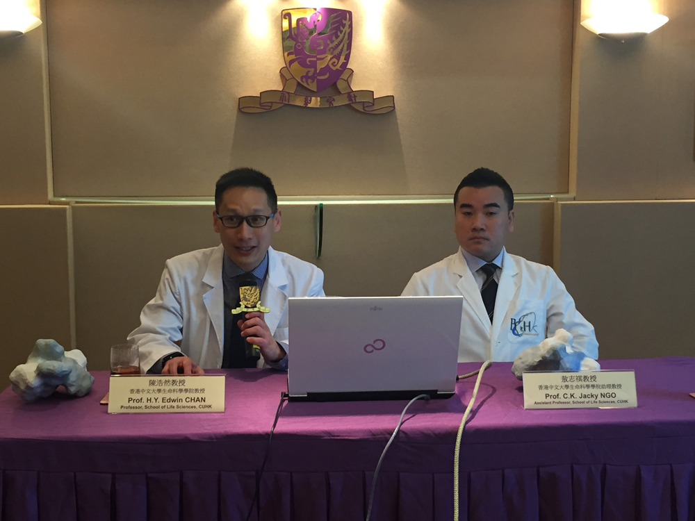 图:中大生命科学院教授陈浩然(左)及其研究团队,成功研发首个由氨基酸肽合成的P3多肽抑制剂