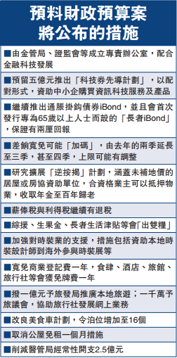 大公网2月24日讯(记者杨致珩)财政司司长曾俊华今日将公布他任内第九份财政预算案。政府近年着力发展创新科技行业,据了解,新一份预算案将预留五亿元推出科技券先导计划,以配对形式资助中小企购买资讯科技服务及产品,当局亦会成立专责办公室,配合金融科技发展。消息指活动策划,由于政府预测来年香港经济会放缓,为纾缓各行各业的压力,新一份预算案会宽免商业登记费一年,食肆、酒店、旅馆、旅行社等则会获免牌费一年,当局亦会拨款予旅游发展局及旅游业议会,协助宣传本地旅游及帮助中小型旅行社发展网上业务。