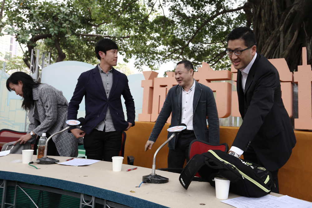 图:(左二起)郑松泰、戴耀廷、林卓廷三人昨日在《城市论坛》节目中互相攻击\大公报记者何嘉骏摄