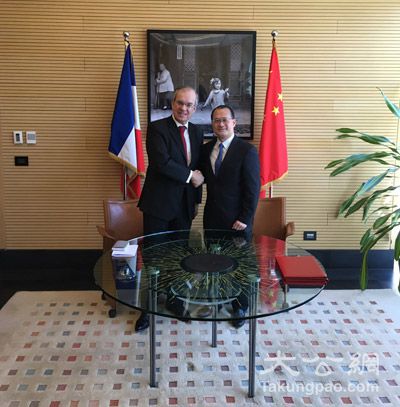 图:新华集团主席蔡冠深(右)与法国驻华大使顾山(左)签署备忘录\大公报记者 孙琳摄