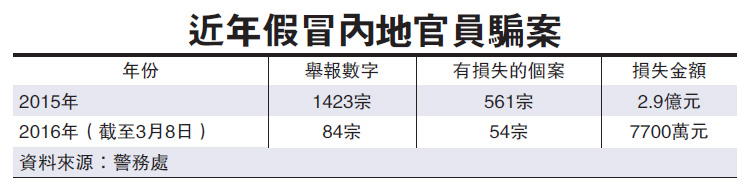 类似假扮公安来电诈骗手法去年肆虐全港,香港警方去年接获高达1423宗报案,比2014年23宗大升60倍,561宗受害人损失2.9亿元,占该年整体电骗案九成损失,虽已较去年七月高峰期838宗回落,现时仍是主要电话诈骗手法。香港警方多次重申,内地执法及司法人员绝不会透过电话要求事主提交保证金。