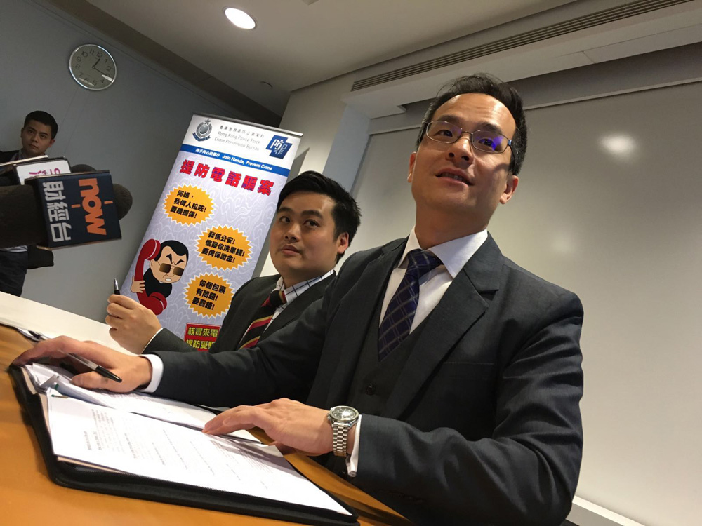 图:东九龙总区重案组总督察林焯豪(右)呼吁接到电话要加倍留心