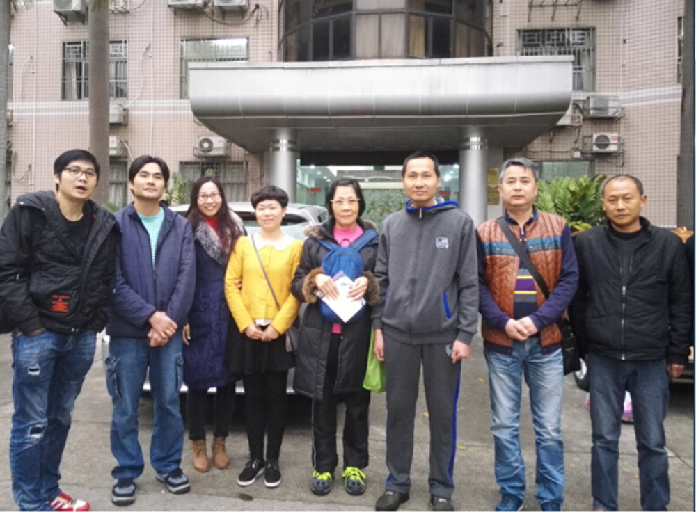 图:湖北荆门救助站一行将谢伟强(右三)送到深圳救助站,助他们一家团圆。左一为谢伟丰、右四为谢伟强妈妈吴女士