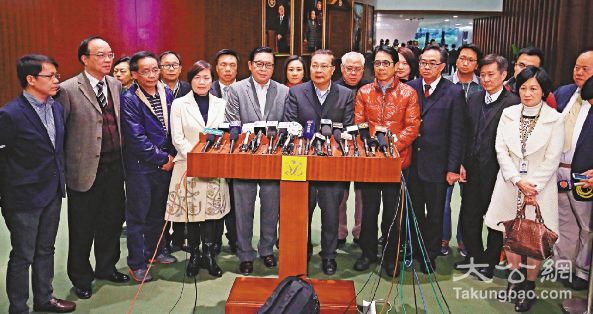 图:建制派议员在会后集体会见传媒,他们认为财委会代主席陈鑑林主持会议符合议事规则,可谓有节有理/大公报记者麦润田摄