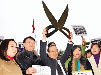 图:工联会到立法会请愿,要求果断剪布,代主席陈鑑林接过金剪,多名议员亦现身支持/大公报记者黄洋港摄