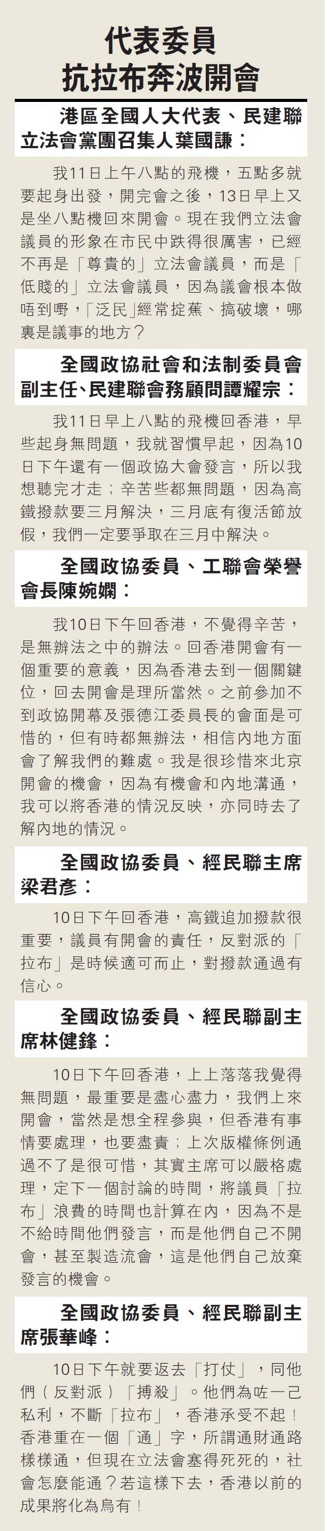 身为全国政协委员的陈监林正在北京出席两会,今日便要为主持周五财委会就追加高铁工程拨款的会议赶回香港。不能无了期地‘拉布’,导致超过追加拨款的死线,这是不负责任的态度,他昨日下午向本报记者表示,财会之前已经为这一议案进行了24小时的会议,充分让议员表达意见,现在的发言都是重复再重复。