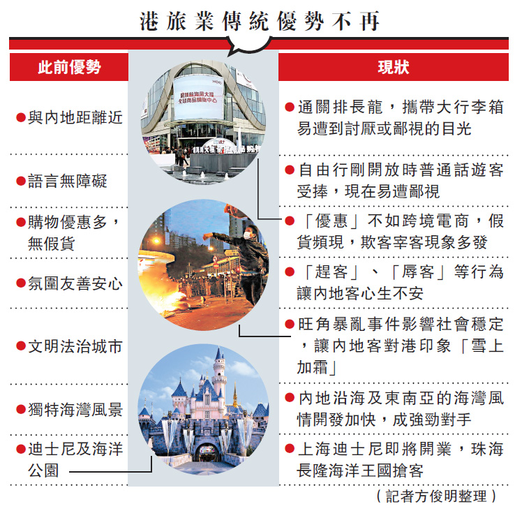 香港近年发生的赶客、旺角暴乱等事件,让内地客对香港印象雪上加霜,特别是中产或新富阶层追求出游体验,若赴港担惊受气,就宁愿远赴欧美更自在。