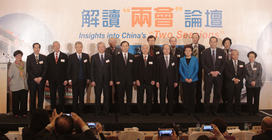 图:香港中华总商会与香港友好协进会联合举办解读两会论坛,邀得两地专家、学者共同探讨国家与香港在两会之后的发展走向,并邀请中联办副主任殷晓静(前排右四)为主礼嘉宾,出席者还有香港中华总商会会长杨钊(前排右六)及香港友好协进会会长戴德丰(前排右五)、刘兆佳(前排右二)以及谭惠珠(前排右一)等/大公报记者林少权摄
