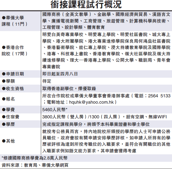 本地升学衔接以外,副学位毕业生将有另一选择。《大公报》于今年一月曾独家报道有关特区政府拟以华侨大学为试点,提供本港副学位毕业生到内地升学衔接学位课程,消息终获证实。