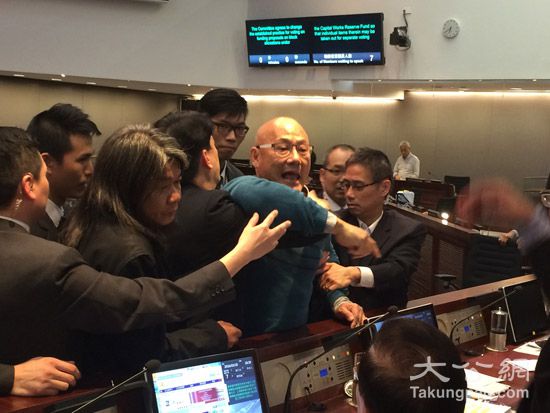 图:陈伟业、梁国雄等人冲击财委会,被逐离场/大公报记者何进昇摄