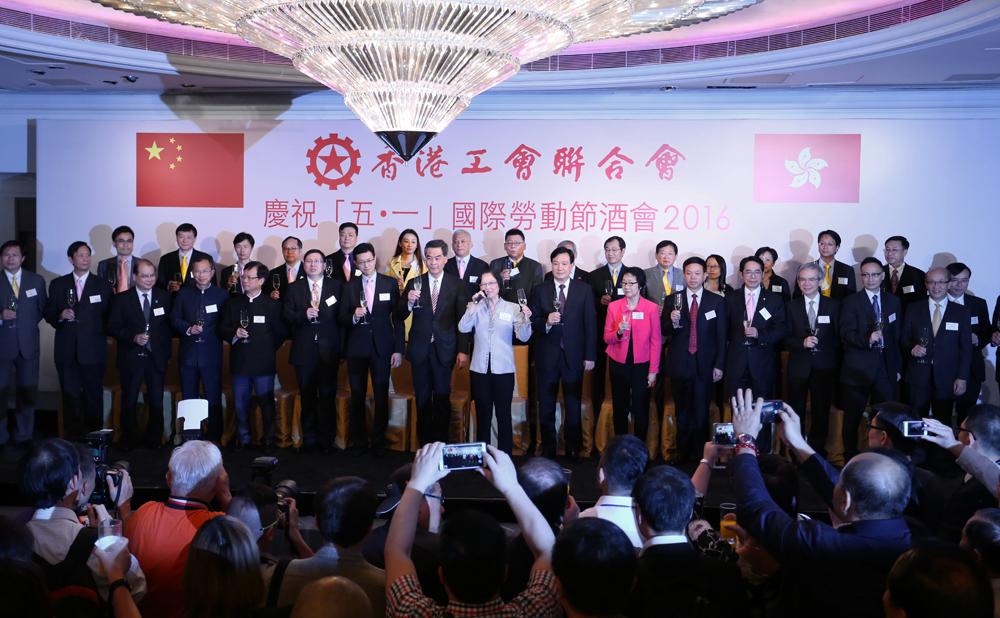工联会昨晚在The Mira Hong Kong举行庆祝五一国际劳动节酒会,邀得行政长官梁振英、中联办副主任林武、驻港部队副司令员廖正荣大校、外交部驻香港特派员公署副特派员宋如安、立法会主席曾钰成、行政会议召集人林焕光等担任主礼嘉宾。