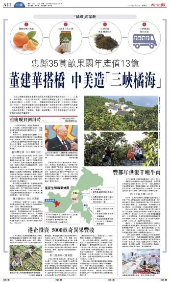 大公网4月27日讯 (记者 石璐杉 韩毅)位于三峡库区腹地的重庆市忠县是世界最适宜柑橘生长地之一。一江碧水,两岸橘香,经过20年的发展,忠县的柑橘种植已达到了35万亩的规模,年产值13亿元(人民币,下同),带动库区移民脱贫致富,已形成从一粒种子到一杯橙汁、再到果渣变肥料的完整产业链。这样高度科学化和标准化的产业,源于美国博富文集团在忠县建设了世界一流的柑橘基地、活动技术中心和加工厂。而为中美共建三峡橘海担当超级联系人的正是香港首任行政长官、全国政协副主席董建华。