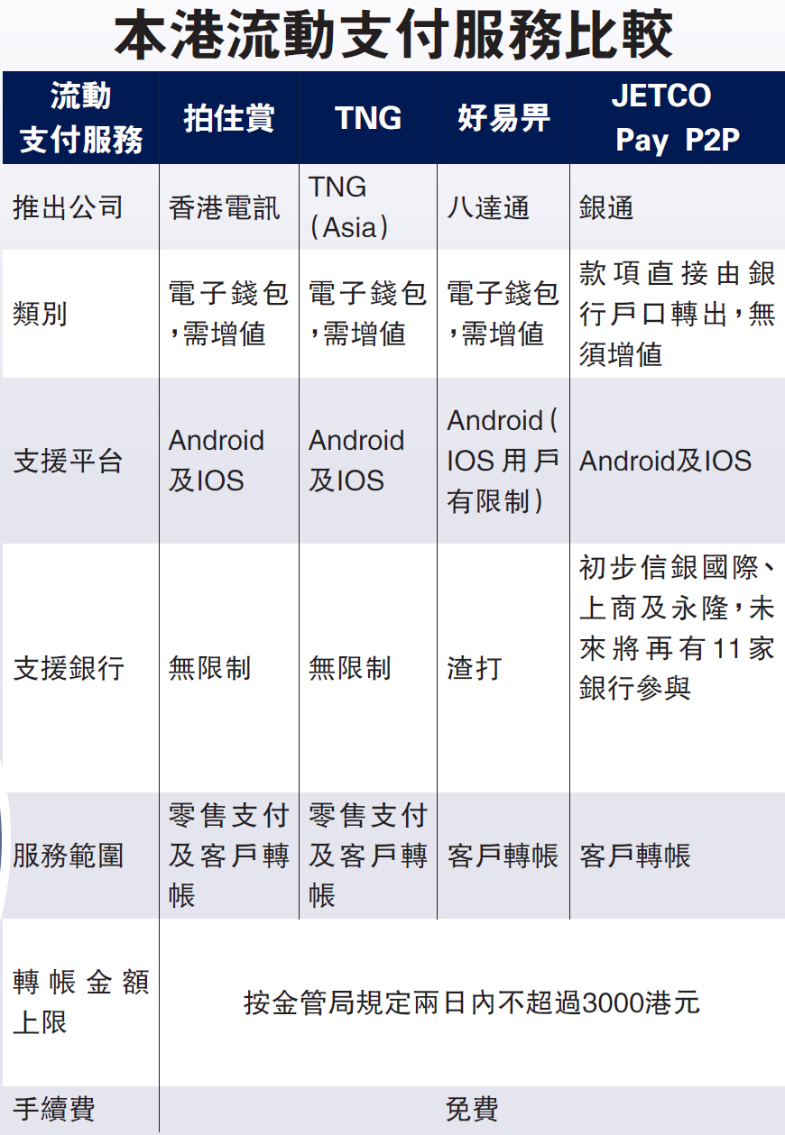 近年,流动支付技术持续在香港发酵,继有香港电讯(06823)推出的Tap & Go(拍住赏),以及TNG电子钱包,最近八达通推出P2P支付服务O! ePay(好易畀),昨日轮到银通推出JETCO Pay P2P流动转帐平台,还有数码通(00315)一直在研发、未知会否推出的KISS,一下子令流动支付市场的竞争升温。