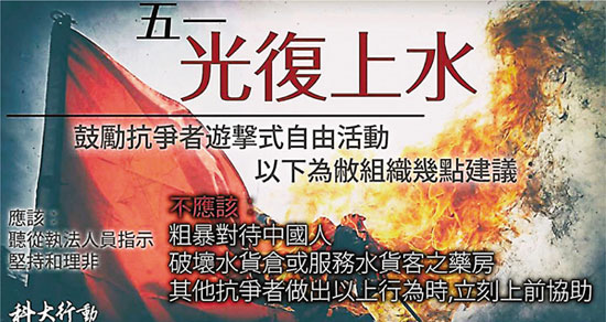 该5个激进组织近日各自在其facebook专页发布消息,称要在5月1日下午3时至6时去光复上水、周末活动,上水齐劳动、买奶粉等,计划在新功街、巷仔街、新成路、石湖墟球场等一直走至上水火车站。其中,科大行动更称鼓励抗争游(游)击式自由活动,并说自己有几点建议,并大字列出不应该做的事,曲线呼吁支持者粗暴对待‘中国人’、破坏水货仓仆服务水货客之药房,以及有其他抗争者做出以上行为时,立刻上前协助,行径极端。