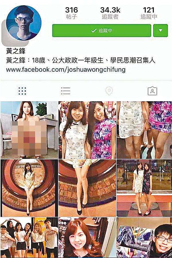 大公网5月8日讯(记者郑治祖)全盛时期的香港众志秘书长黄之锋真系可以得罪好多人。前晚深夜,有人发现黄之锋的Instagram(IG)户口中,活动!有一幅几近全裸及多张身穿旗袍的艳女照,更有多张前学民思潮成员卢彦慧的照片,部分的拍摄角度瞄准对方的下半身(见图)。尽管黄在得悉后迅速删除了有关照片,但已有网民截图放上高登讨论区,大批网民即时留言耻笑。