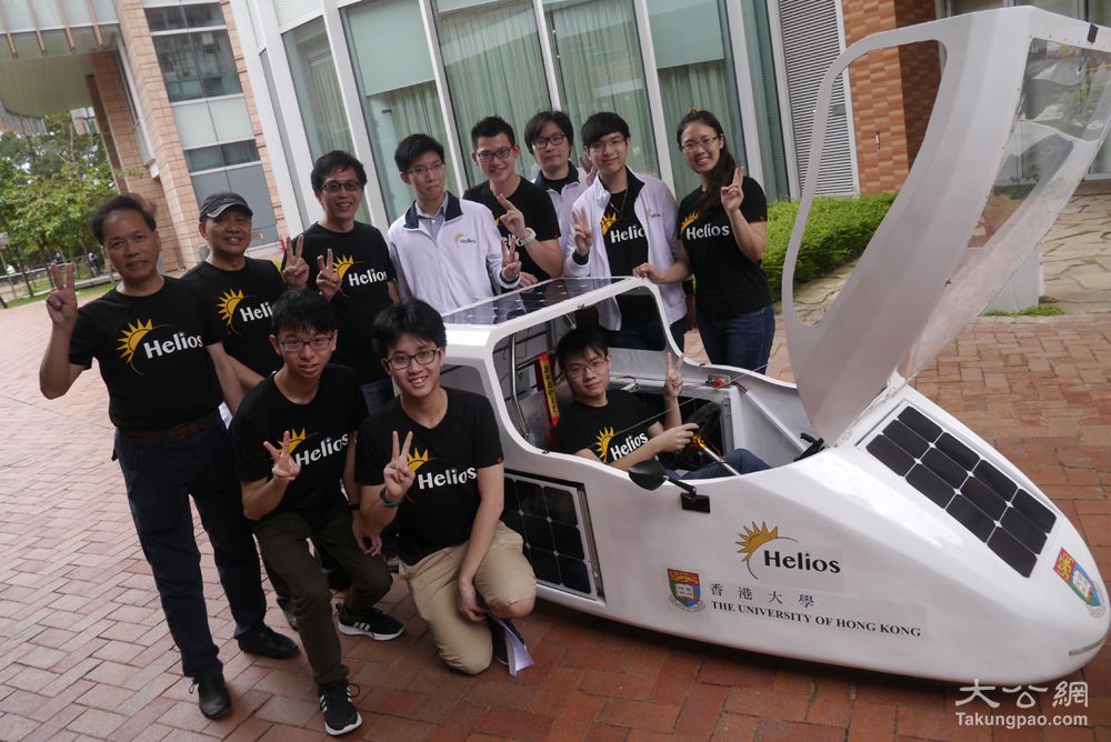 这队太阳能车研发队伍,以希腊神话的Helios(太阳神)命名,于去年六月成立,并在今年一月份在全港五所院校共八支队伍中脱颖而出,夺得新能源,新时代太阳能车比赛总冠军奖及由汽车业界参与评选的创新设计奖。队伍由助理教授陈国梁、工程师王德燊及陈洁华等机械工程系的教授和研究人员领导,而团队中16名学生来自工程学院的机械工程、电机及电子工程,以及工业及制造系统工程等多个学系。该车制作成本十馀万元。