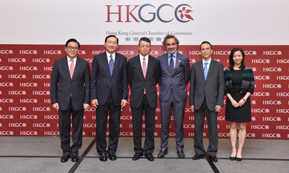 图:总商会新一届理事会,左起立法会代表林健锋、活动,副主席王冬胜、主席吴天海、常务副主席夏雅朗、副主席李泽鉅、总裁袁莎妮/香港总商会提供图片
