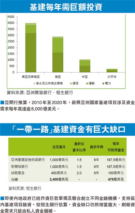 不少研究显示,新兴亚洲国家对基础设施投资需求殷切。根据亚洲开发银行(Asian Development Bank)推算,目前至2020年,新兴亚洲国家基建项目涉及资金需求每年高达逾8,000亿美元。即使内地政府已经斥资巨款单独及联合创立不同金融机构,支持区内基建项目融资,但据估算,资金缺口仍然相当庞大,剩余资金需求只能由私人资金填补,这将成为香港可以分食的大蛋糕。