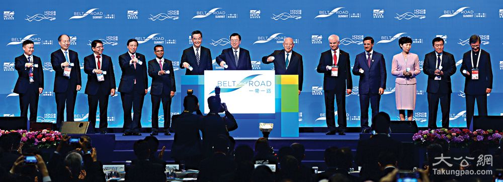 图:全国人大常委会委员长张德江与一众嘉宾在香港会议展览中心主持一带一路高峰论坛开幕仪式/大公报记者林良坚摄