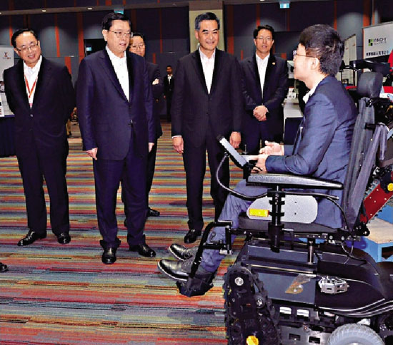 一间本地创科初创企业代表昨日在香港科学园向张德江(左二)介绍多功能电动轮椅。旁为梁振英(右三)、张晓明(右二)和杨伟雄(左一)