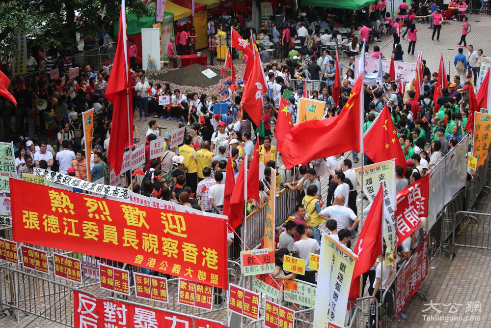 来自爱港之声、中港促进融合会、反黑金关注组、五邑两联总会、香港导游总工会、香港旅游业从业员联会、香港旅游促进会等多个团体逾百名市民,昨日一早到达湾仔中环广场旁的集会区域,欢迎张德江委员长视察香港。