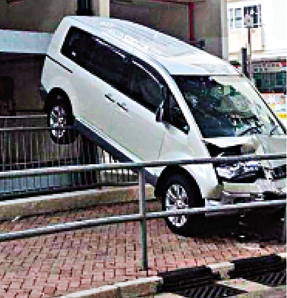 事发于昨晨7时20分,肇事七人车拟离开停车场,途经一楼一处右转弯位时突告失控,车头直撞向一列铁栏河,全车冲落约三米下的行人路上,当场发出隆然巨响。七人车的车头严重毁烂,气袋弹出,更撞及行人路一个路牌及铁围栏,车尾则搁在栏杆上,被撞栏杆亦告弯曲,车上的男司机一度受伤被困。
