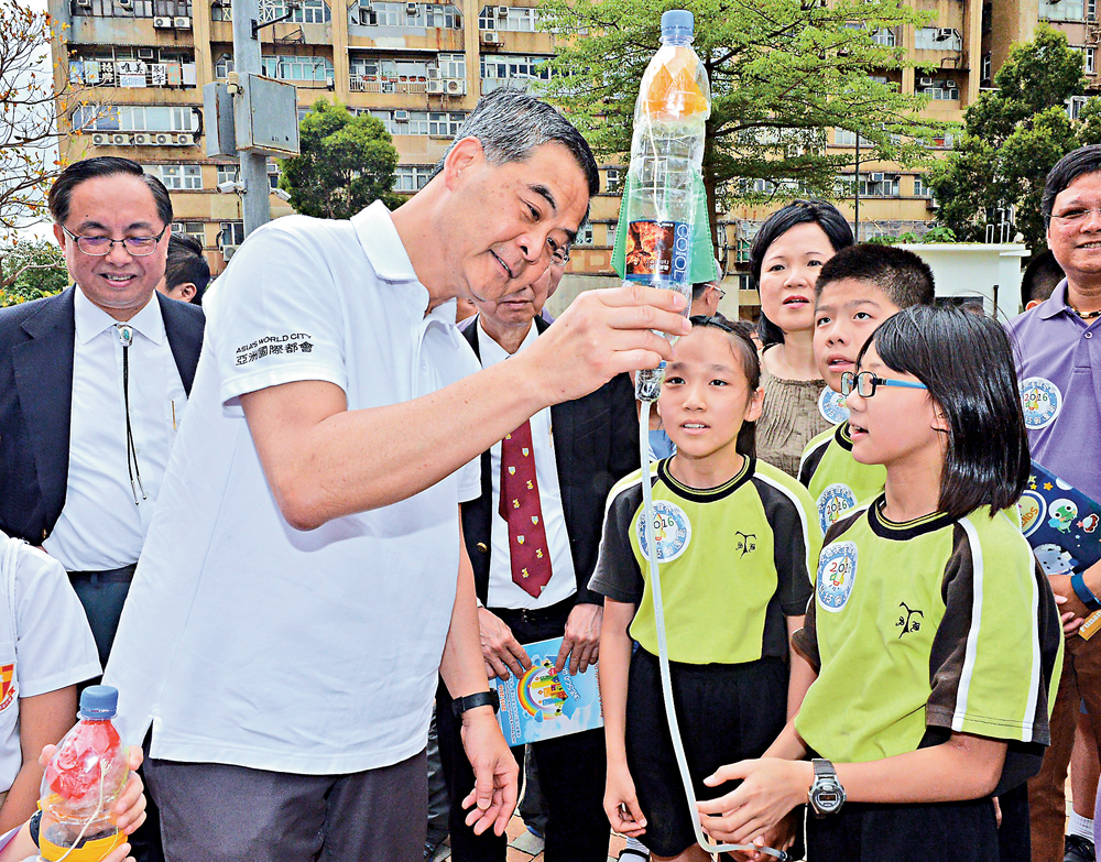 图:行政长官梁振英昨联同创科局局长杨伟雄等政府官员,出席学界水火箭比赛,并与小学生交流