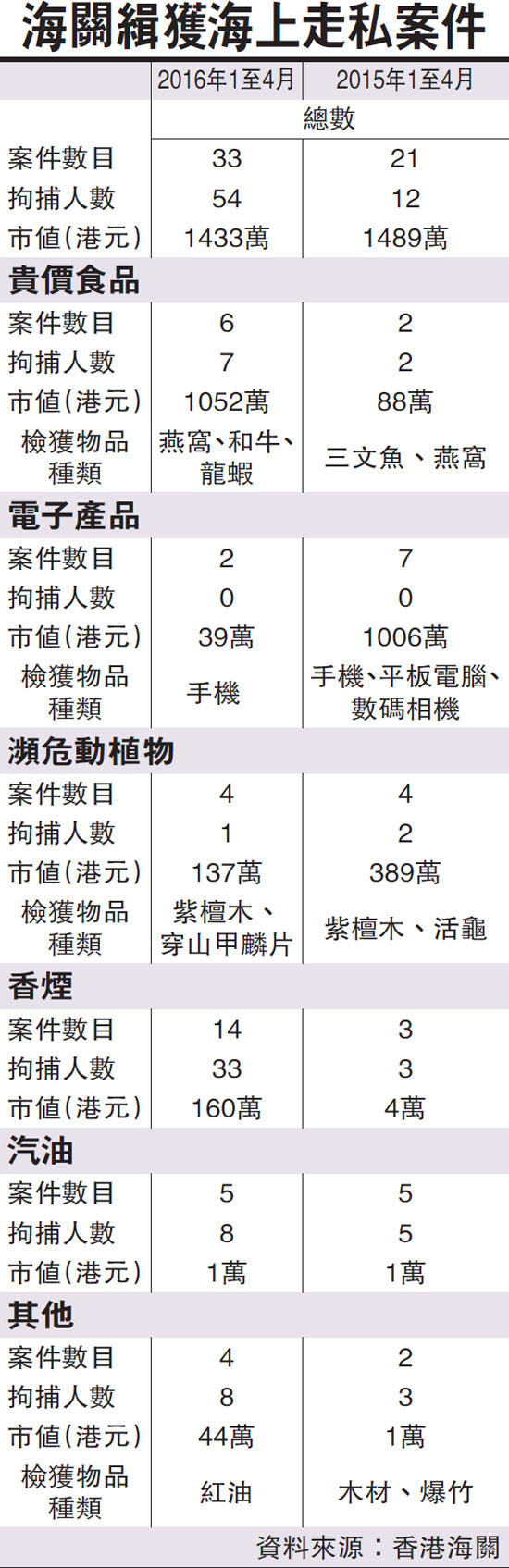 香港海关今年首四个月侦破33宗海上走私案件,较去年同期21宗多六成,检获1433万元货品,拘捕54人,扣留八艘船及五辆车,而单是其中六宗检获的高价食品已总值1052万元,佔去所有案件七成。(详见附表)