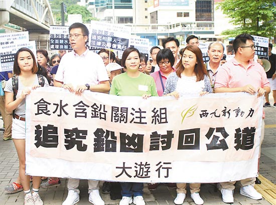 食水含铅关注组及西九新动力,与受铅祸影响的居民于昨日举行游行,不满未有官员就事件问责下台。