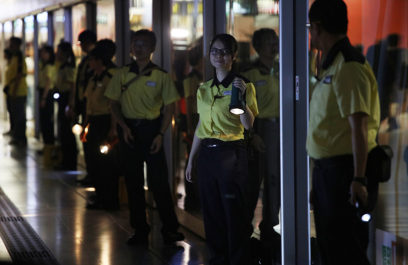 图:港铁职员手持电筒在月台幕门旁排成一行,准备为乘客照明\大公报记者蔡文豪摄