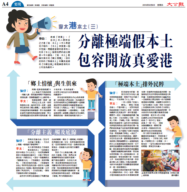 李太:我都睇到啊,热爱、认同自己土生土长、亲切熟悉的土地、城市好正常。其实,这是与生俱来的乡土情怀:就是大家对香港这座城市的归属感,对本地在经济社会等方面所取得成就的自豪感,对本地集体记忆及历史建筑保育的重视,对本地美景、美食的偏爱,以至对本地生活方式和价值观的维护等。