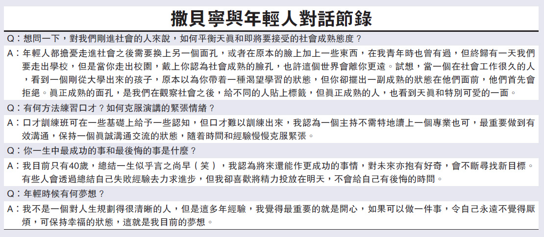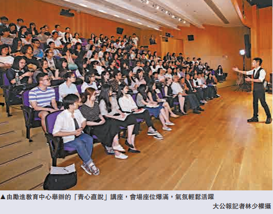 由励进教育中心举办的青心直说讲座,以青少年为主要对象,主讲嘉宾亦以年轻人为主,昨日在港岛中华基督教会公理堂举办的首场讲座,便邀得央视名嘴撒贝宁任头炮嘉宾,范太亲自担任主持。会场二百座位爆满,气氛轻松活跃,欢乐甚多,撒贝宁的新婚外籍妻子李白亦到来为丈夫打气。