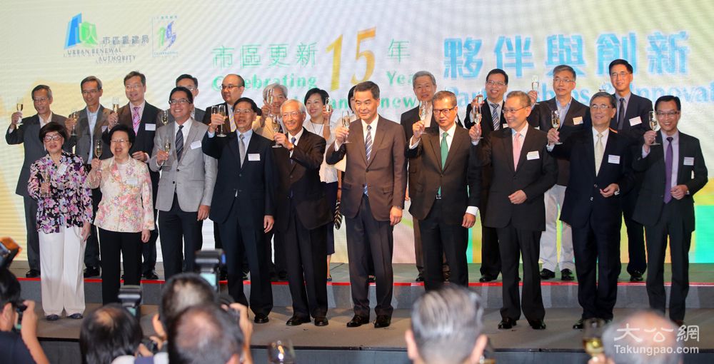 图:行政长官梁振英昨日傍晚出席市建局十五周年酒会。图为(前排左起)前市建局董事会成员林贝聿嘉、前市建局董事会成员谭惠珠、发展局常任秘书长(规划及地政)黄伟纶、前市建局行政总监林中麟、市建局主席苏庆和、梁振英、发展局局长陈茂波、前市建局主席郑维新、市建局行政总监林浚、候任市建局行政总监韦志成与其他主礼嘉宾主持祝酒仪式\大公报记者麦润田摄