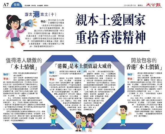 本土它所反映的,是香港人对这个城市朴素的、与生俱来的热爱之情,也是一种对自身成长的城市的责任感。本土正如同一个香港人常用的词语本港,都是代表了对这个城市的认同。这种对本土的热爱与归属,并不掺杂其他的功利意图,更不意味着必须与其他城市对立,也不是要通过丑化他人来提升自己。