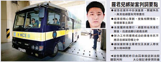 大公网6月17日讯(记者叶汉亮)连锁时装店堡狮龙(bossini)创办人罗定邦孙女罗君儿绑架案中,自称是跑腿的内地男子郑兴旺,昨日在高等法院被判囚12年。法官薛伟成于判刑时称,郑兴旺在案中一直担任重要角色,斥绑架是极其可恶罪行,利用事主及家人惶恐情绪,勒索巨额赎金,而本案是跨境罪案,被告及绑匪打算于事成后立即潜逃返内地,以逃避香港警方到内地执法,是严重加刑因素。警方欢迎法庭裁决,认为今次判罚刑期具阻吓性,可警惕其他人不要以身试法。