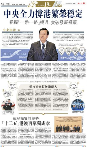 Õŵ½ǿµ÷£¬ÖÐÑëÕþ¸®¸ß¶ÈÖØÊÓÏã¸ÛµÄ·±ÈÙÎȶ¨ºÍÔÚ¹ú¼ÒÕ½ÂÔ´ó¾ÖÖеÄ×÷Óã¬Ö§³ÖÏã¸Û¹®¹Ì¼ÈÓÐÓÅÊÆ¡¢¿ª·¢ÐÂÓÅÊÆ£¬Ö§³ÖÏã¸Û¼ÓÇ¿ÓëÄڵصĽ»Á÷ºÏ×÷£¬Ö§³ÖÏã¸ÛÍØÕ¹¹ú¼Ê¾Ã³ÁªÏµ¡£Í¬Ê±£¬Ïã¸ÛÒ²Òª¸ü¼Ó»ý¼«Ö÷¶¯µØ²ÎÓë¹ú¼Ò·¢Õ¹Õ½ÂÔ¡£ÖÐÑëÕþ¸®½«Ö§³ÖÏã¸ÛÔÚËĸö·½Ãæ·¢»Ó»ý¼«×÷Ó㬰üÀ¨Ö÷¶¯¶Ô½ÓÒ»´øÒ»Â·£¬´òÔì×ۺϷþÎñƽ̨£»Ãé×¼×ʽðÈÚͨ£¬Íƶ¯ÈËÃñ±Ò¹ú¼Ê»¯ºÍÒ»´øÒ»Â·Í¶ÈÚ×ÊÆ½Ì¨½¨É裻¾Û½¹ÈËÎĽ»Á÷£¬´Ù½øÒ»´øÒ»Â·ÑØÏßÃñÐÄÏàͨ£»ÒÔ¼°ÉÓëÄڵغÏ×÷£¬¹²Í¬¿ª±ÙÒ»´øÒ»Â·Êг¡¡£