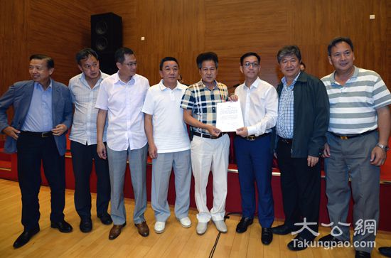 图:刘业强(右三)接下过半数乡议局执行委员的联署信\大公报记者林良坚摄