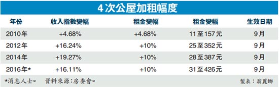 大公网6月28日讯(记者翁丽娜)全港逾75万个公屋户最快今年9月加租。房委会消息人士表示,根据房屋署抽样调查4.8万个公屋户的家庭收入的结果,发现公屋居民在2013年至2015年这两年平均收入上升16.11%,按现时租金调整机制,租金最多可加10%,即每户每月加31元至426元,平均加租约170元。这是公屋连续第3次隔年加租10%(见表)。立法会房屋事务委员会将于明日开会讨论,房委会亦于下月初开会商讨。
