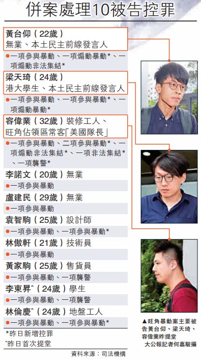 10名被告分别为黄台仰(22岁,无业)、梁天琦(24岁,港大学生)、容伟业(32岁,装修工人)、李诺文(20岁,无业)、卢建民(29岁,无业)、袁智驹(25岁,设计师)、林傲轩(21岁,技术员)、黄家驹(25岁,售货员),以及两名首次提堂的被告李东昇(24岁,学生)、林伦庆(24岁,地盘工人)。