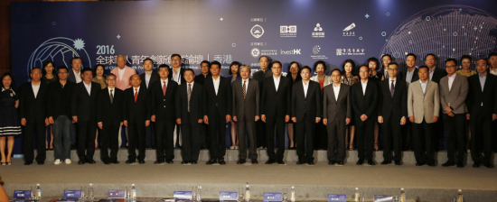 图:2016全球华人青年创新创业论坛昨日举行。图为曾俊华(前排右七)、赵玉金(前排左七)、施荣怀(前排右六)、创新及科技局常任秘书长卓永兴(前排左六)与其他嘉宾合照 大公报记者林少权/摄