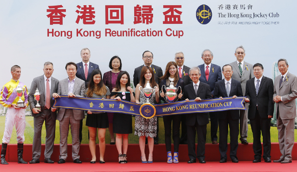 图:杨健(前排右三)、林焕光(前排右四)、宋如安(前排右二)、叶锡安(前排右一)与马会一众董事及行政总裁应家柏(后排左一),同为香港回归盃颁奖