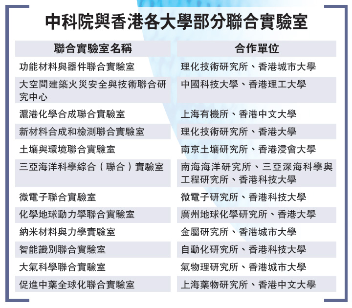 去年年底,中科院心理所与香港中文大学心理系成立生物社会心理学联合实验室。记者发现,在20多家中科院与香港联合实验室中涉及到前沿科技的各领域,包括本港见长的材料、无机化学、医学等领域,也有微电子、机器人学等前沿项目。本港着名化学家支志明就参与了两项实验室计划。