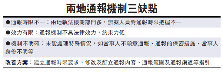 公安机关认为,现时机制存在三大缺点,包括通报无时限要求,办案人员对通报时限把握不一。其次是通报机制不具法律效力,加上签署双方是公安部港澳台事务办公室和特区政府保安局,约束力较低;加上通报机制存在许多不明确因素,如遇上当事人不愿意通报、重大案件通报后如何保密、当事人身份不明等特殊情况,均缺乏指引,大大影响机制效率。