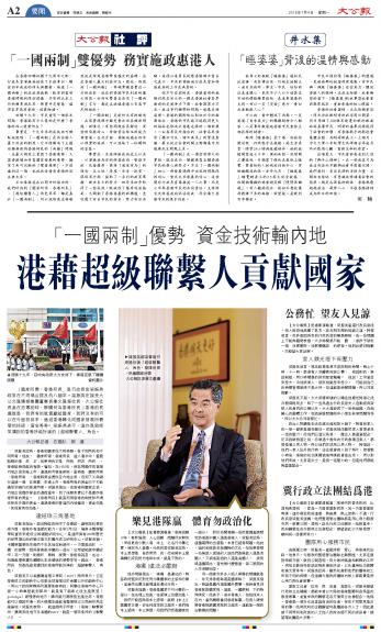 大公网7月4日讯(记者石璐杉、邓湄)国家所需,香港所长是行政长官梁振英经常在不同场合提及的八个字。梁振英在接受大公文汇传媒集团董事长兼文汇报社长、大公报社长姜在忠专访时,解构何为香港所长:香港的长处就是,我们有的就贡献给国家,我们没有的可以在外面找回来,通过香港转化成国家发展所需要的技术、资金等等。梁振英表示,这亦是他经常讲到的香港所能扮演的超级联系人角色。