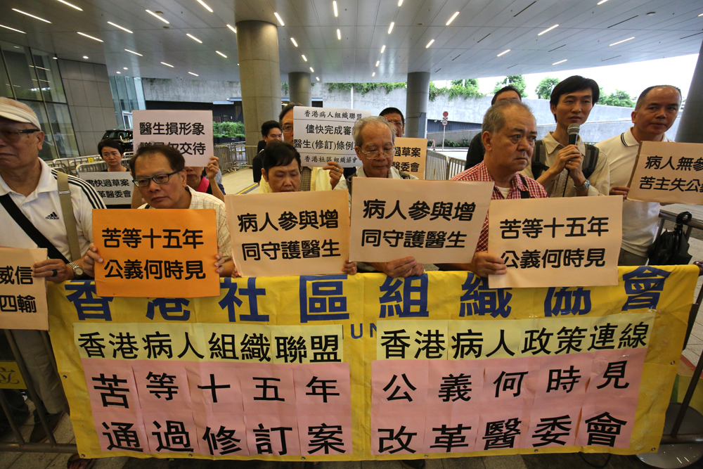 改革医务委员会的《2016年医生註册(修订)条例草案》,在立法会恢復二读辩论,香港社区组织协会、香港病人组织联盟及香港病人政策连线共约20人,到立法会外请愿,要求议员尽快通过草案。他们高叫苦等15年 公义何时见等口号,又点名批评议员郭家麒及梁家骝。