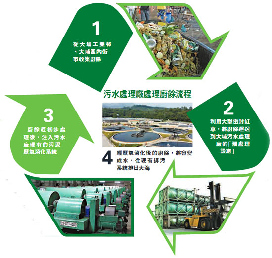大公网7月7日讯 (记者 梁康然)行政长官今年初在《施政报告》提出新方法处理厨余的计划细节曝光。环境保护署将与渠务署合作,在大埔污水处理厂推行为期六年的厨余、污泥共厌氧消化试验计划,将在大埔收集的厨余,运送到大埔污水处理厂,进行初步处理,然后与污泥混合,进行共厌氧消化。环保署预计,新的厨余处理设施可望在2018年投入服务,每日可处理最多50吨厨余。