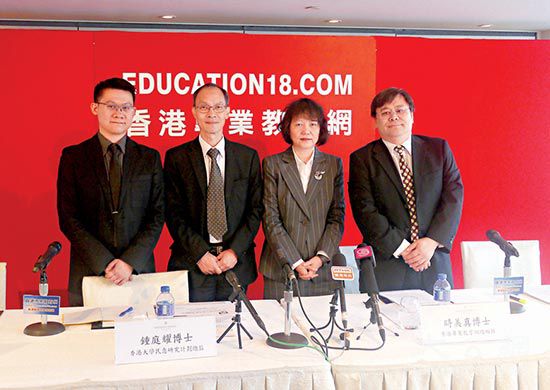 图左起:香港大学民意研究计划研究助理李伟健,总监钟庭耀,香港专业教育网总编辑时美真,编辑林德明/大公报记者唐晓明摄
