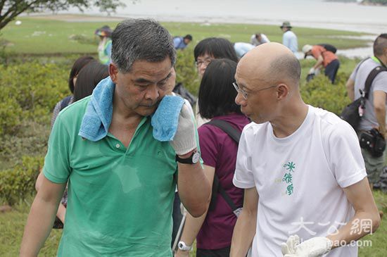 图:梁振英(左)与黄锦星(右),为清洁海岸身体力行,市民大感振奋\大公报记者林少权摄